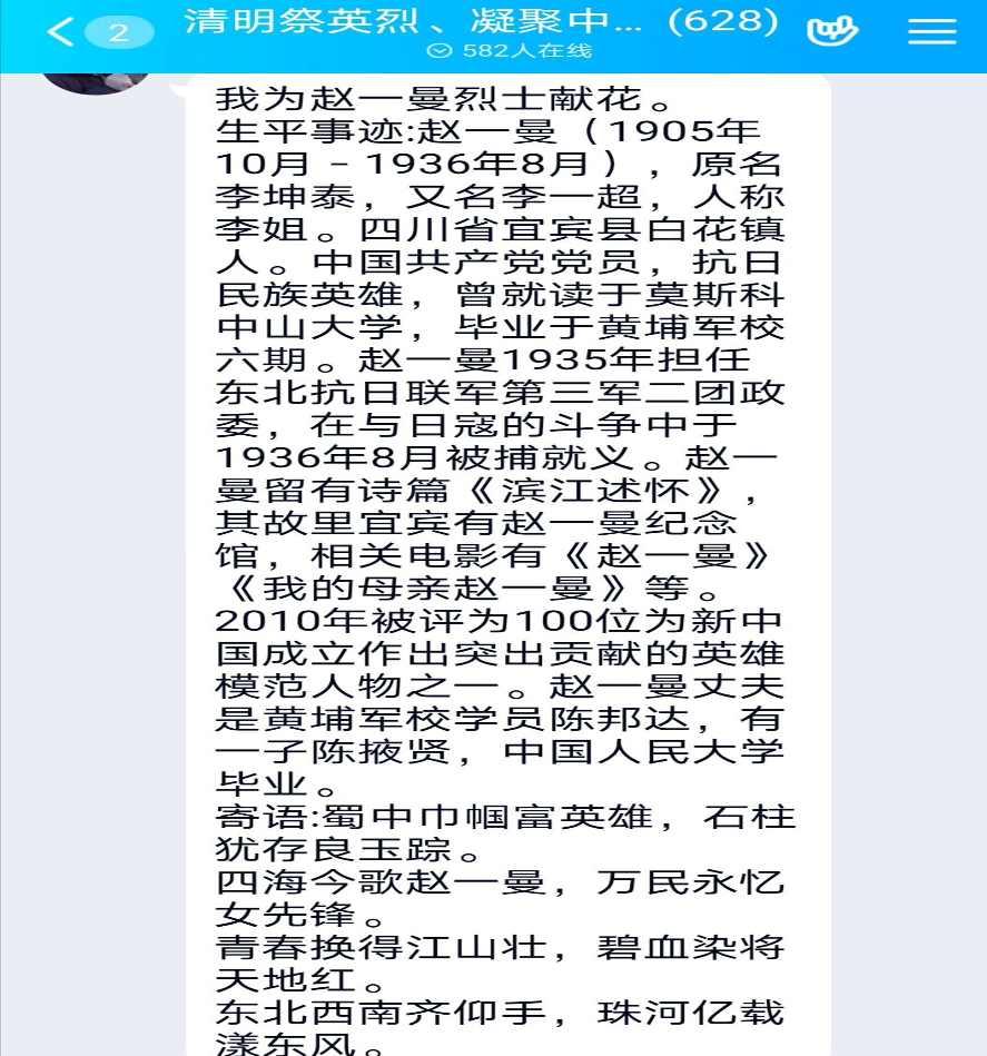 商学院2019级—2017级共有五百多名同学参加本次活动。活动中,同学们通过关注“宿州烈士陵园”微信公众号、登录“中华英烈网”,线上走进英烈纪念馆、烈士陵园,观看烈士遗物、家书和事迹史料,通过多种方式进行网上祭扫。为深刻表达对英烈们的崇高敬意和无限缅怀,网上祭扫后,同学们又将英烈们的伟大事迹分享到活动QQ群。