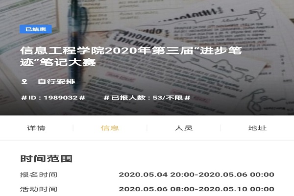 在这个全国上下一心抗击疫情的特殊时刻,网课成为我们在家上课学习的途径。为进一步加强学院学风建设,引导学生掌握正确有效的笔记方法,营造良好课堂学习氛围,树立文明课堂形象。信息工程学院学生会组织部于2020年5月6日至5月10日成功举办第三届“进步笔迹”笔记比赛。