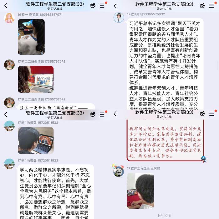 会议进行到第二流程,支部书记和全体学生党员交流讨论,领悟“两会”精神。在发言过程中,每位同学都认真听取积极互动,踊跃参与其中。此次发言互动,大家都收获良多。