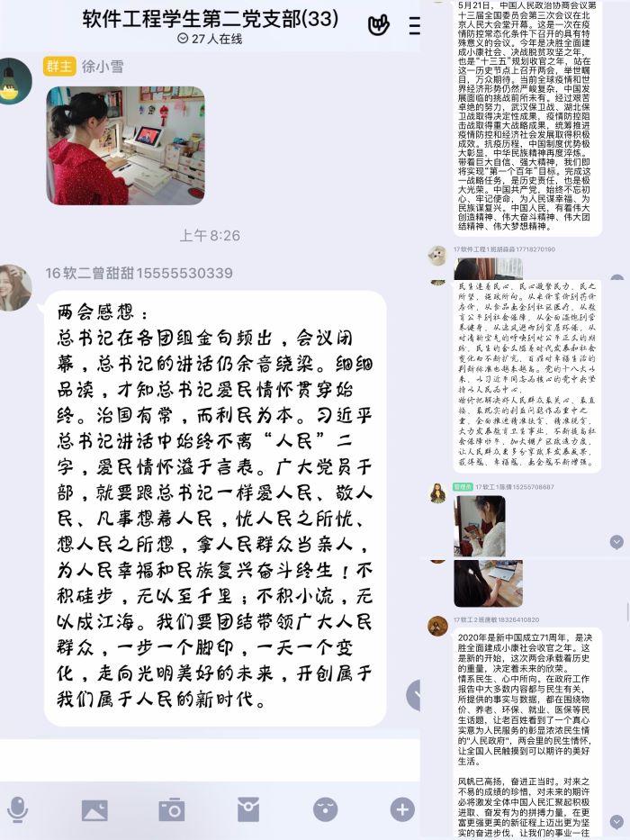 全国政协十三届三次会议和十三届全国人大三次会议于5月21、22日在北京开幕。中央广播电视台、中央电视台、人民日报、人民网等中央媒体将进行现场直播和实时报道。5月22日,信息工程学院软件工程学生第二党支部全体学生开展学习会议——收看“两会”实况报道和学习“两会”精神。