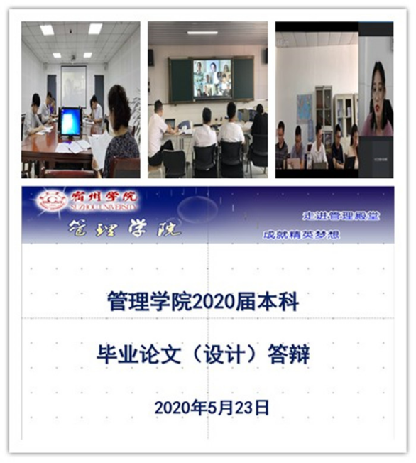 为贯彻落实教育部、省教育厅和学校关于新冠肺炎疫情防控工作要求,保障广大师生的健康安全,稳步推进2020届本科毕业论文(设计)工作,根据《宿州学院本科毕业论文(设计)管理办法》(校教字[2017]53号)、关于发布《宿州学院2020届本科毕业论文(设计)工作实施方案》的通知、《宿州学院关于进一步加强疫情防控期间教学工作安排通知》(教务处发〔2020〕6号)、《关于我校2020届本科毕业论文(设计)答辩工作的通知》(教务处发〔2020〕18号)、关于发布《管理学院2020届本科毕业论文(设计)工作实施方案》、《管理学院2020届本科毕业论文(设计)答辩工作总体方案》、《关于开展我院2020届本科毕业论文(设计)相似性检测及答辩工作的通知》等文件精神和学院毕业论文领导小组工作部署要求,学院于2020年5月23日顺利完成了2020届本科生毕业论文(设计)答辩工作。