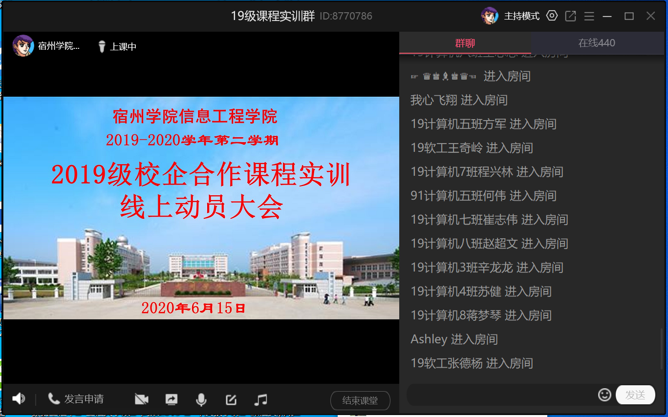 2020年6月15日上午8:00,信息工程学院通过腾讯课堂举行了“信息工程学院2019-2020学年第二学期2019级校企合作课程实训线上动员大会”。信息工程学院副院长吴孝银、实习实训中心主任潘正高、实验员王柯柯、实训指导老师以及2019级全体本科学生参加了此次动员大会,会议由潘正高老师主持。