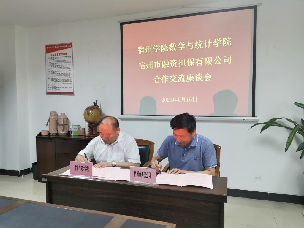 为加强校企合作,提高人才培养质量,拓宽毕业生实习就业渠道,6月16日上午,数学与统计学院和宿州市融资担保有限公司校企合作签约仪式在宿州市博文大厦四楼会议室举行,全面开启校企合作。宿州市融资担保有限公司董事长蒋永久、总经理助理、风控部部长路春梅、工会主席王小莉、计划财务部部长季修万、综合管理部副部长王虎,数统学院院长宁群、实习实训中心主任武以敏、应用数学与金融工程教研室主任李耀红参加了会议。签约仪式由蒋永久主持。