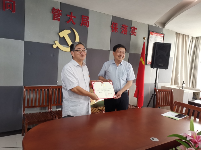 徐基贵代表化学化工学院对创佳安全环境科技有限公司在实习实践等方面给予学院师生大力支持和帮助表示衷心的感谢。之后,徐基贵代表化学化工学院对创佳安全环境科技有限公司进行宿州学院教师应用能力发展工作站授牌仪式,并聘任创佳安全环境科技有限公司秦淑国、王玉峰为宿州学院化学化工学院应用化学专业建设指导委员会专家委员,并颁发聘书。