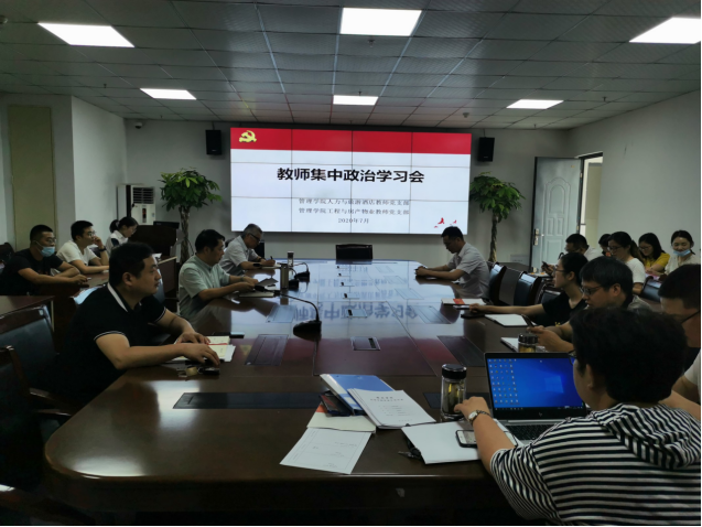7月14日上午,管理学院召开了教师集中政治学习会,人力与旅游酒店教师党支部和工程与房产物业教师党支部全体教师参会,党总支刘大为书记领学并发言。