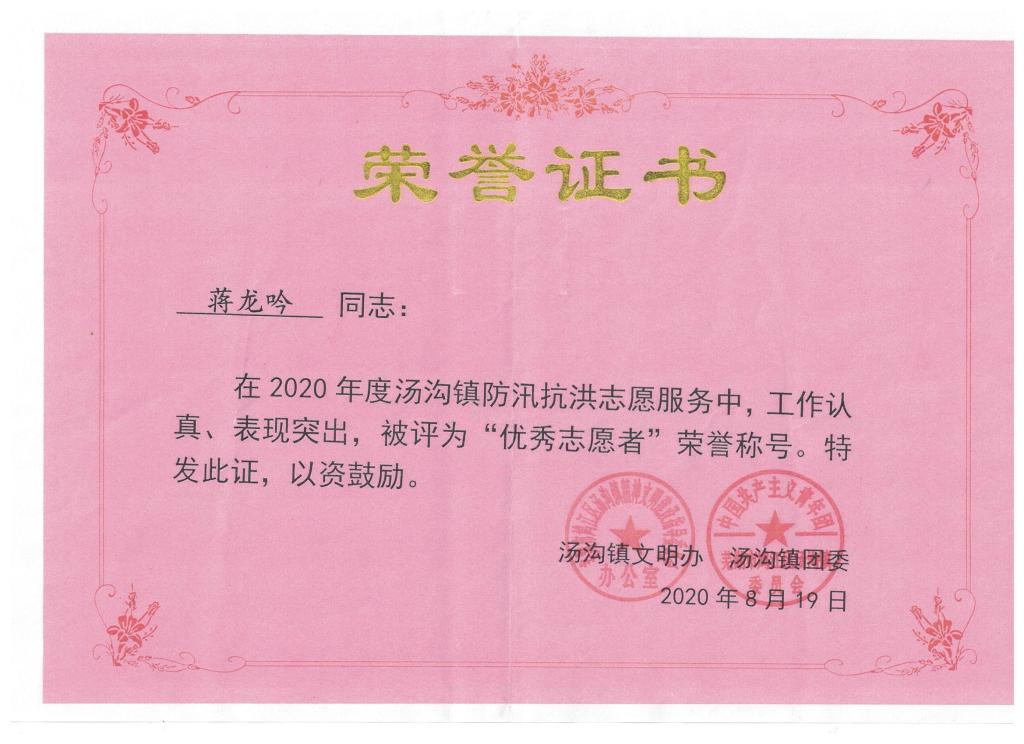 在7月26日—8月10日,为期14天的志愿服务工作当中,蒋龙吟及其所在的防汛小组,不畏风吹雨打,不惧蚊虫叮咬,日夜坚守在堤坝之上。饿了就啃方便面,渴了就喝矿泉水,寻堤的时候越是泥泞的地方越要仔细检查,一天下来鞋子沾满了於泥全部湿透,而晚上因为大坝经过白天太阳的炙烤显得空气十分的燥热,蚊虫也是呱噪扰人。