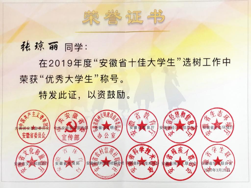 经团省委、省委宣传部、省文明办、省教育厅、省经信厅、省生态环境厅、省文化和旅游厅、省体育局、省联社、省科协、省残联和省学联研究,公布了2019年“安徽省十佳大学生”大学生获奖者名单,生工学院张琼丽同学被授予“安徽省优秀大学生”称号。