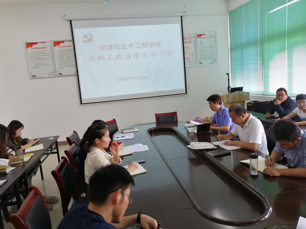 9月23日下午,资源与土木工程学院在三楼会议室召开全体教职工理论学习会,深入学习《习近平谈治国理政》第三卷,传达省委教育工委、省教育厅有关文件精神。学习会由党总支书记刘领主持。