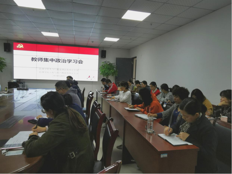 10月14日下午,管理学院召开教师集中政治学习会,人力与旅游酒店教师党支部和工程与房产物业教师党支部全体教师参会,教师支部书记王淑霞、王元宝领学。