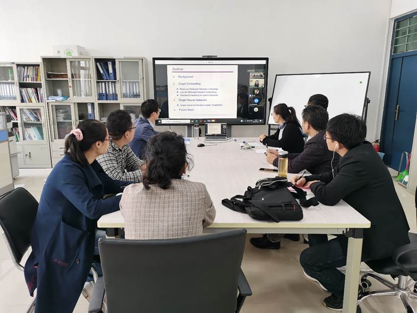 Hong Yang博士后的研究方向是图神经网络与图像处理,是当今数据挖掘的研究热点,学院许多教师也从事此方面的研究。首先,Hong Yang博士后指出从社交网络、生物图、引文网络到事务数据,网络和图数据被广泛用于描述大量的现实世界应用程序。为了从网络数据中获取知识,人们已提出许多种网络机器学习模型,如图嵌入模型和图神经网络。从图嵌入模型的角度来看,属性网络嵌入是一个新的模型分支,其目的是从属性网络中获取知识,其中节点的属性和节点之间的链接都是可观察的,以供学习。现有的属性网络嵌入模型能够实现节点链接和属性的联合表示学习。然而,这些模型都是在连续的欧几里德空间中设计的,这种空间常常引入数据冗余,从而给大规模网络的存储和计算成本带来挑战。另一方面,从图神经网络(GNNs)的角度来看,现有的基于属性网络的图神经网络都是基于人工设计的图神经网络结构,这往往需要大量的人工操作和丰富的领域知识。