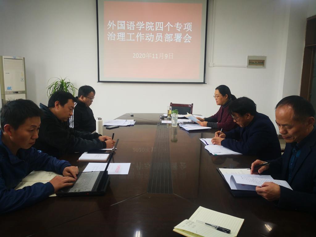11月9日,外国语学院在逸夫楼A318会议室召开四个专项治理工作动员部署会。党总支书记王华、院长李加强、副书记、副院长郝景东、总支委员、科级干部、支部书记参会。会议由党总支书记王华主持。