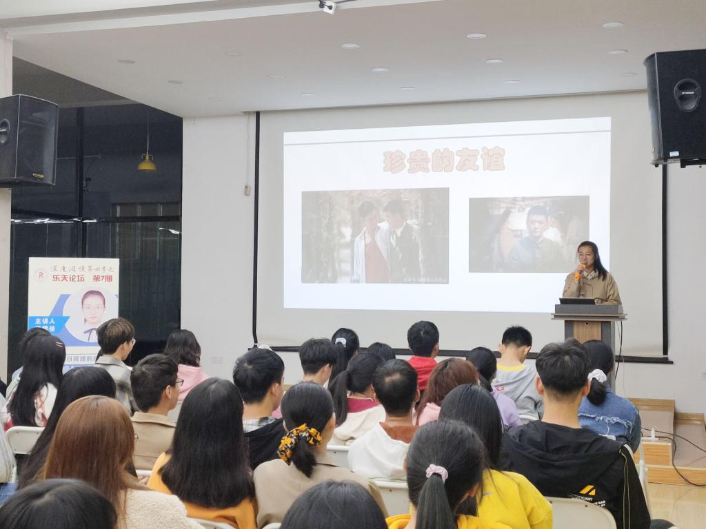 11日7日晚上,乐天论坛第7期“奋斗是明日辉煌的前奏——走进《平凡的世界》”读书沙龙活动在创客空间二楼举行。本次活动由图书馆主办,读者协会承办。主讲人为吴雯佳,来自外国语学院。环境与测绘学院学生王思远为本场活动主持人,60名同学参与论坛。