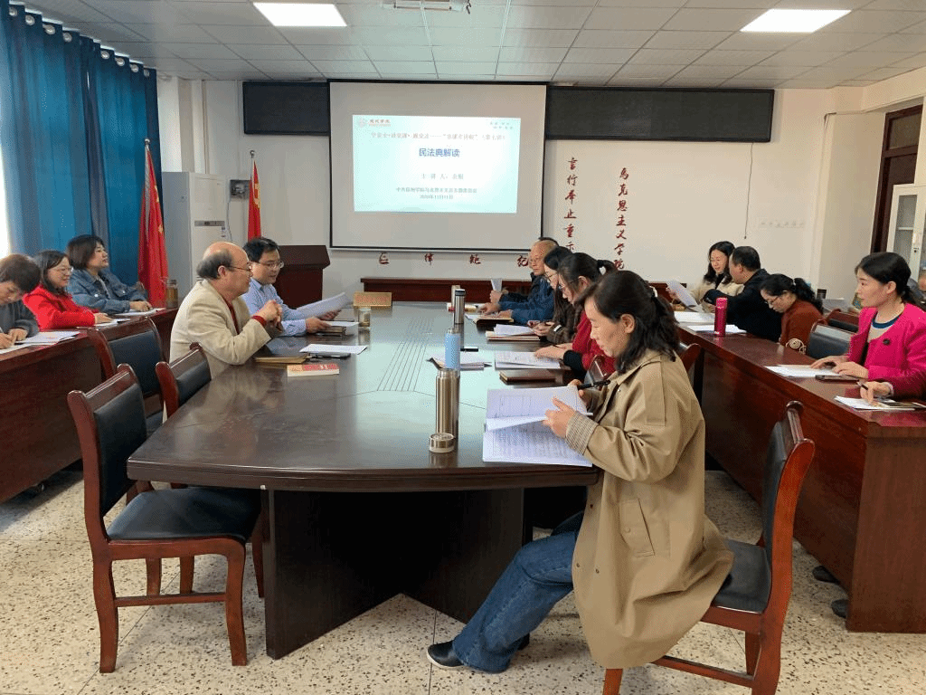 余鲲老师从“民法典的编纂历程”“民法典的框架结构及亮点”两个方面对“民法典”有关内容进行了全面深入的阐释。她说,民法典七编1260条,与以往单行的民事法律条文相比新增加了居住权、占有、保理合同、物业服务合同、隐私权和个人信息保护、环境污染和生态破坏责任等很多内容,还有原有法律条文的修改和完善,体现了对生命健康、财产安全、交易便利、生活幸福、人格尊严等各方面权利的平等保护。承载着人民期待、凝结着几代法律人梦想的民法典必将为更好满足人民日益增长的美好生活需要提供坚实法治保障。