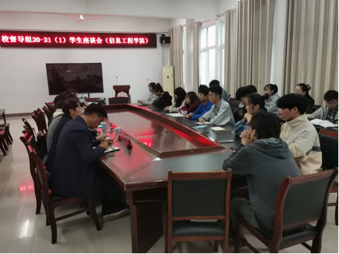 2020年11月18日下午,校教学督导委员会主任蔡红,教学督导委员钱玉梅一行深入信息工程学院调研指导教学工作。信息工程学院党总支副书记吴翠华、副院长吴孝银、教学督导、教师代表、学生代表参加了本次座谈会。