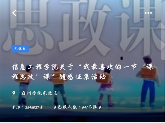 为了帮助学生更好地树立自己的人生观,价值观,世界观,也为了引导学生提高思想道德素质和法治素养,信息工程学院学生会权益维护中心于2020年11月21日至11月23日在线上举办“我最喜欢的一节‘课程思政’课”随感征集活动。本次活动的参与人员有参赛选手以及评委。