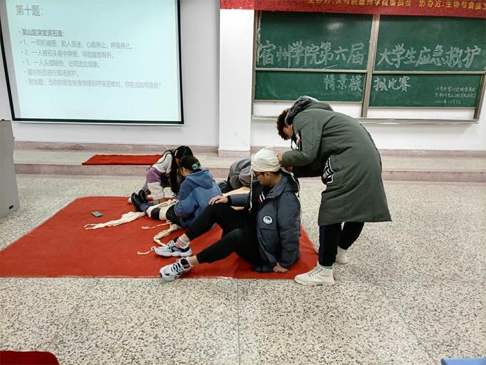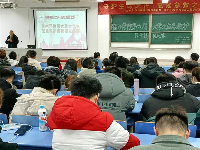为增强同学们对疾病预防的本领,提高学生们面对突发事件和紧急避险逃生自救互救能力。12月9日下午2点,由共青团宿州学院委员会主办,生物与食品工程学院团总支承办、宿州市红十字精神传播大队协办的宿州学院第六届大学生应急救护情景模拟比赛于教学楼B301举办。本次比赛邀请到中国著名急救培训专家岳勋老师,矿建总医院急诊科向斌主任,资深志愿者李正平队长。