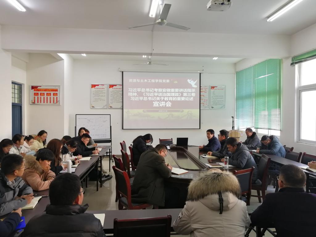 按照宿州学院党委《关于开展习近平总书记考察安徽重要讲话指示精神、<习近平谈治国理政>第三卷、习近平总书记关于教育的重要论述宣讲活动的通知》(校党宣字〔2020〕10号)要求,12月16日下午,资源与土木工程学院党委举办了习近平总书记重要论述专题宣讲会。我校宣讲团成员、马克思主义学院党总支副书记常守柱教授担任主讲人,学院全体教职工及部分学生代表出席宣讲会。