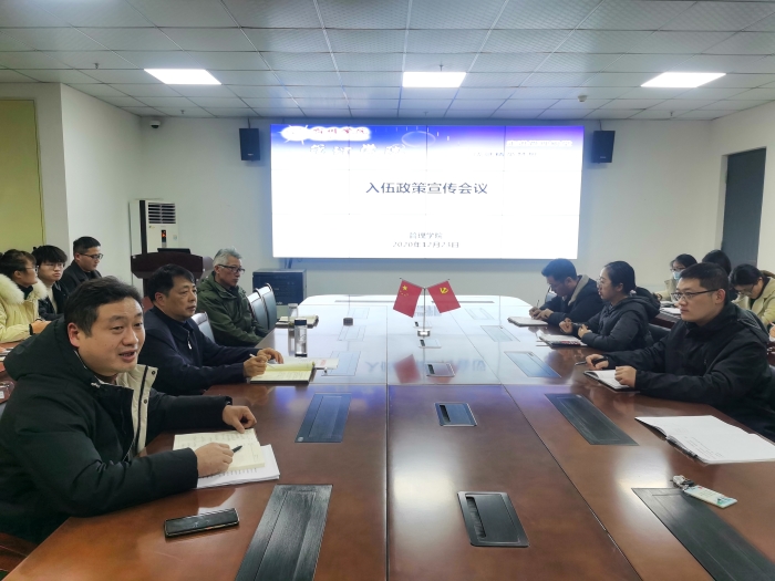 为响应国家鼓励大学生入伍号召,培养青年大学生的爱国情怀与责任担当,丰富大学生的个人经历。12月23日,管理学院于实训楼C301召开入伍政策宣传会议,党委书记刘大为主持召开,党委副书记王永宁、副院长韩传龙及各班辅导员参加。