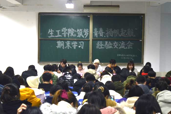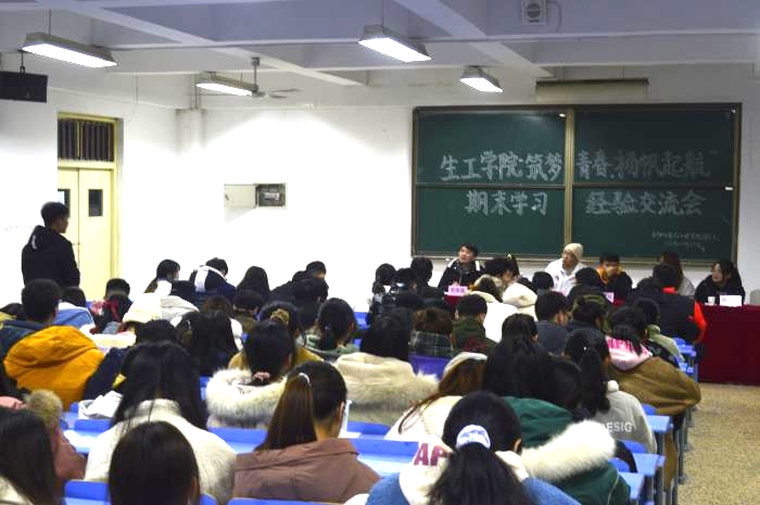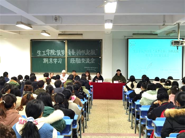12月25日晚7点,为使同学们全面了解期末考试,用科学的方法来备考、迎考,缓解焦虑和压力,同时也为进一步营造期末学习氛围,生工学院于教学楼B201举办2020年“畅谈经验,交流分享”期末学习经验交流会,2020级全体学生参加。