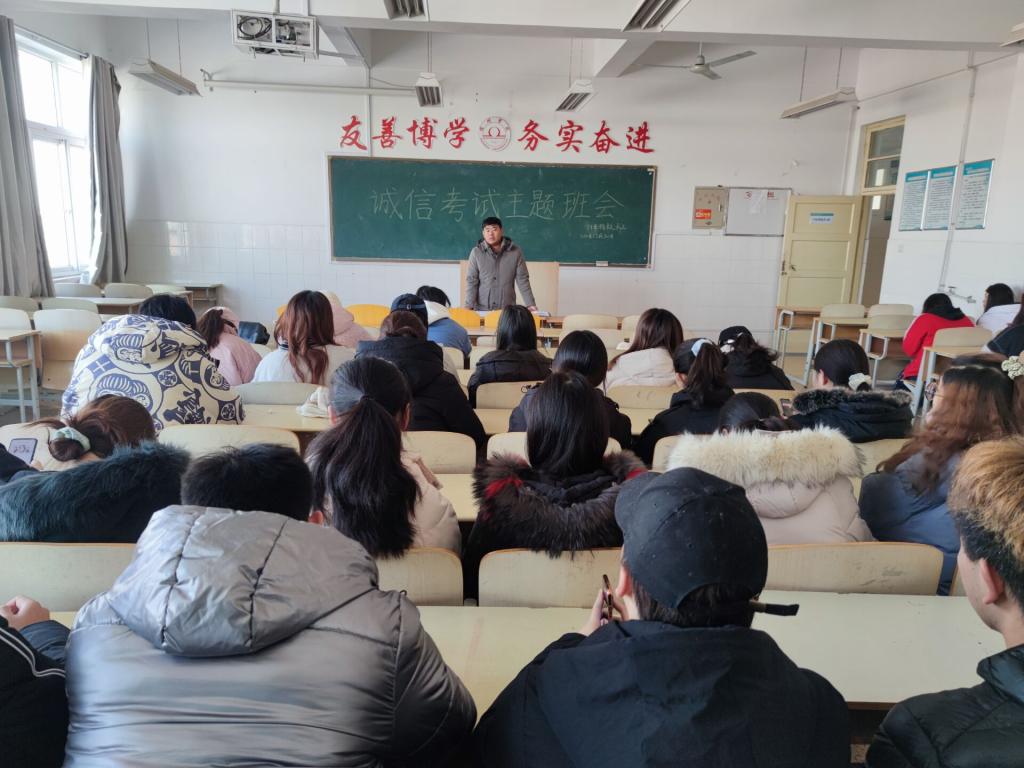 各班辅导员带领班级学生认真学习《国家教育考试违规处理办法》(教育部令第33号)、《宿州学院学生违纪处分办法》、《宿州学院学生违反考试纪律处分办法》等文件内容,加强学生考试纪律和法规教育,引导学生诚实做人,诚信考试,大力弘扬“诚信考试光荣,违纪舞弊可耻”的校园风尚。同时通过学校历年来发生的考试违纪典型案例的讲述,引导广大学生自觉遵守考试纪律,认清违纪作弊的严重性、危害性。认真做好期末复习备考,抛弃侥幸心理,抵制和预防违纪作弊行为的发生。