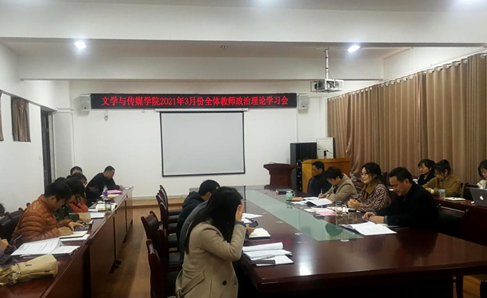 3月5日下午,文学与传媒学院3月份全体教师政治理论学习大会在教学楼A303办公室召开。党委书记李月云、院长蒋宗霞、副书记王绍卫、副院长张德岁及全体教师参会,会议由李月云主持。