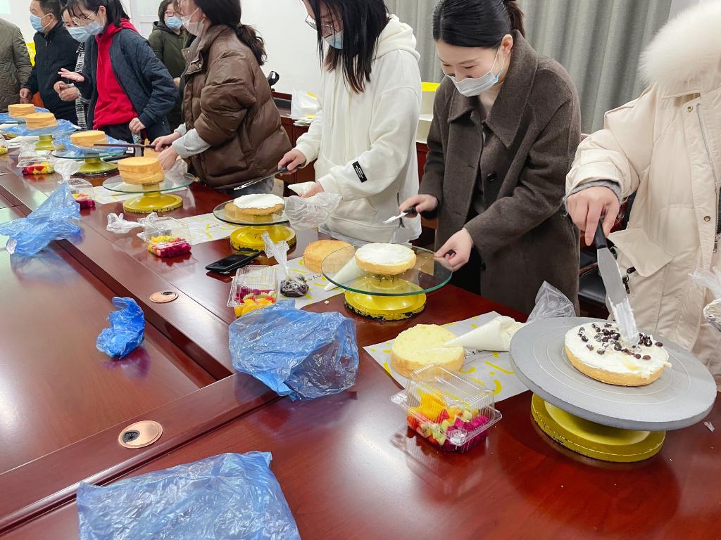活动中,各位女教职工在专业蛋糕师傅的指导下,亲手制作蛋糕。蛋糕师傅讲解了蛋糕的制作原理和裱花的技术,介绍了各种材料之间的搭配比例等烘焙知识,并现场为大家展示蛋糕的具体制作过程。各位女教职工积极动手、踊跃参与,结合自己的审美创意亲手制作蛋糕作品。从做蛋糕前的准备到材料的摆放、奶油的涂抹、装饰造型等等,每一个环节大家都一丝不苟,在各展所长的同时,也品尝到了付出努力后的甜美成果,活动在轻松欢快的氛围中圆满结束。
