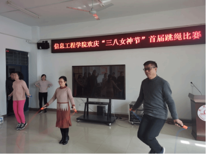 为庆祝“三八”妇女节,丰富教职工文体生活,展示教职工的精神风貌,增强教职工的体育锻炼意识和身体素质,提升教职工向心力和凝聚力,展示教职工积极向上的精神风貌,信息工程学院于2021年3月10日中午举办了“欢庆’三八’节,跳动身心悦”首届跳绳比赛。学院党政领导班子对本次活动给予了大力支持,同事们热情高涨,参与率很高。