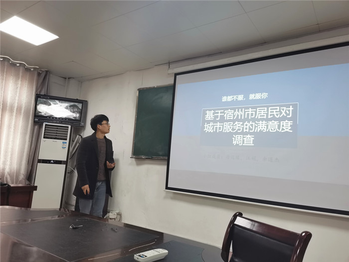 参加本次选拔赛的选手一共有7组,选题多样,有关注校园安全的《校园霸凌的分析与解决-以宿州为例》、有研究市民满意度的《基于宿州市民对城市服务的满意度调查》、还有探讨人口老龄化的《关于宿州市社区养老调研》等。每组选手赛前做了精心准备,结合幻灯片进行5分钟的作品汇报和2分钟的回答问题。评委老师就学术作品的可行性、创新性、科学性和先进性、实用性等几个方面进行现场评分,就作品中存在的问题与各组负责人进行了细化讨论,提出了指导性的改进意见和建议。