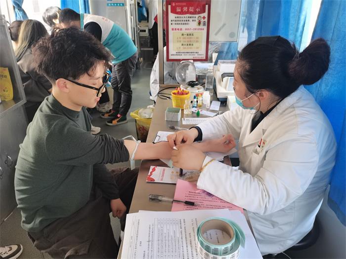 初春天气微凉,但挡不住宿州学院学子对于献血的热情。在一食堂门口,显眼的献血车和宣传海报,忙碌的工作人员,热情洋溢的志愿者,使过往的师生都纷纷驻足询问,有的甚至主动拿表登记,准备献血。献血车前排起了长龙。活动中,志愿者们配合医护人员开展献血指导、填表登记、血型测定等各项工作,并维持现场秩序。此外,志愿者们还为献血者倒水以及发放献血证和小礼品。在闲暇之余志愿者们也会义无反顾的加入献血的队伍中。另外,值得称赞的是有些人无偿献血已经不止一次了。有些人虽是初次献血,但眼神中却没有害怕,有的只是坚定与无私,他们希望能通过自己一点一滴的付出,为病患者们提供帮助。
