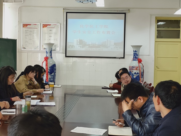 4月14日下午14:00,化学化工学院在实验楼四楼会议室召开学生安全工作布置会。会议由化学化工学院党委书记徐基贵主持,副院长卓馨、副书记史洪伟及全体辅导员参加。
