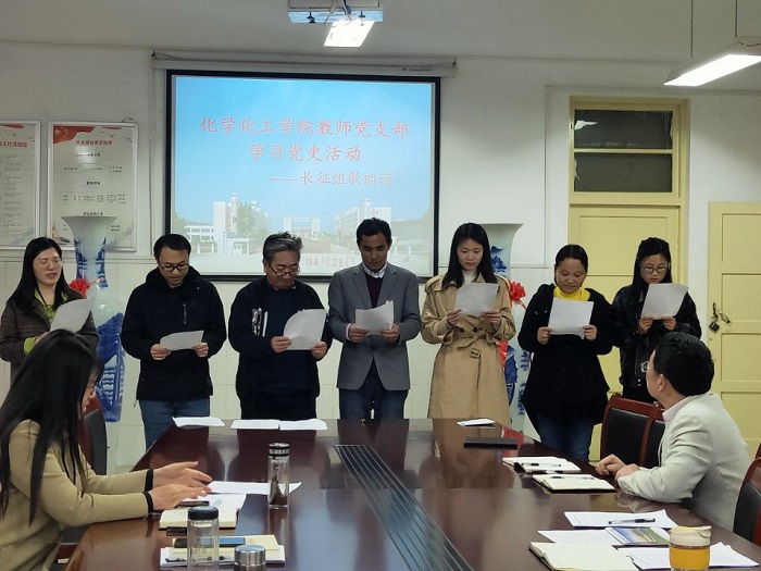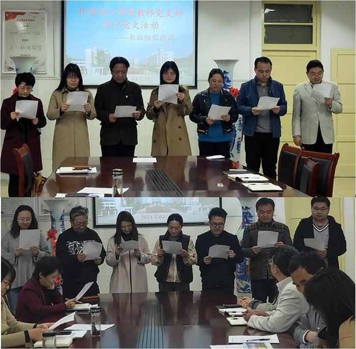 根据宿州学院3月16日召开的2021年全面从严治党工作暨党史学习教育动员部署会议精神和化学化工学院教工党支部的党史学习计划安排,4月21日下午在学院会议室,应用化学与新能源教工党支部开展了学党史长征组歌朗诵活动。