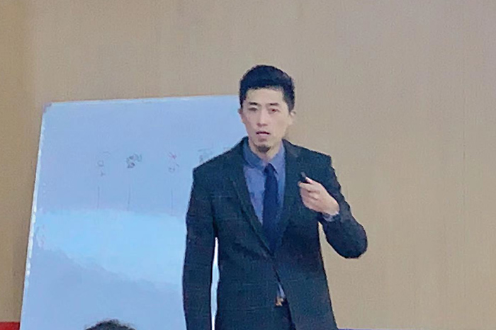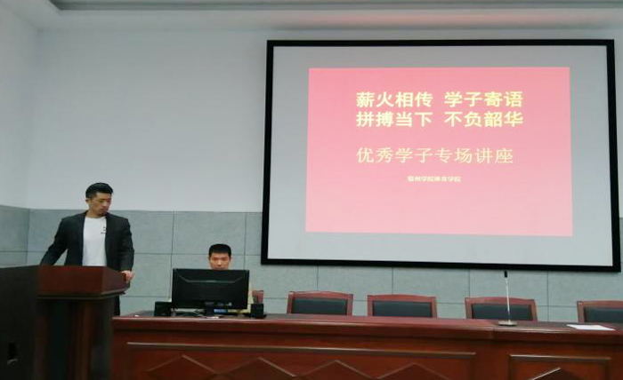 郭雷,2010年毕业于宿州学院体育系体育教育专业,目前就职于安徽金仕堡健身俱乐部,任私教部区域总监一职。报告会上,郭雷通过ppt首先介绍了他所在公司的规模、经营模式及公司对人才的培养现状等,通过图片、数据和视频等方式更直观的展示精彩的职场现状。接着他以学长的身份给学弟学妹们分享了他的学习和工作经验。一是待人处事和蔼友善,始终秉承着待人友善的态度处理人际关系;二是对待工作要勤劳、勇敢。天道酬勤,相信勤能补拙。在单位或者公司工作,一定要敢于担当,勇于承担。三要多读书,多学习,努力提高自身素质、学识修养,不仅要有强壮的身体,更要有强大的内心。
