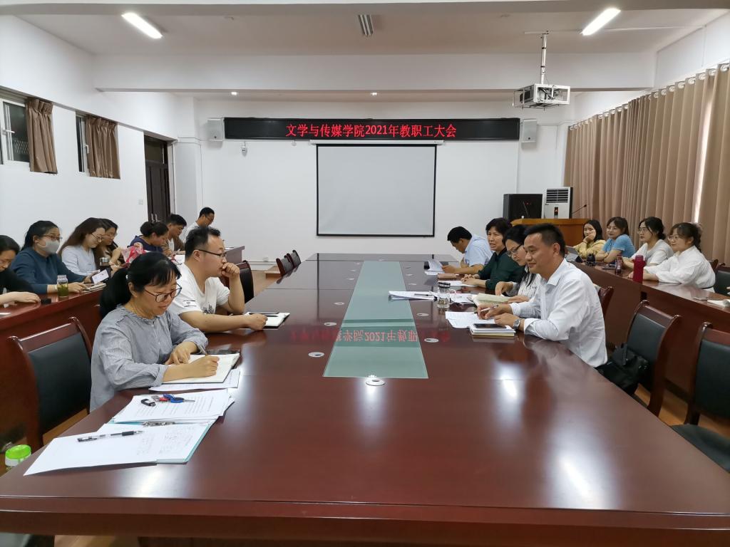 5月26日下午2:30,文学与传媒学院在东教A303召开第四届教职工大会,文学与传媒学院党总支书记李月云、院长蒋宗霞、副书记王绍卫、副院长张德岁、院工会主席张琳及全体教职工参加此次会议。