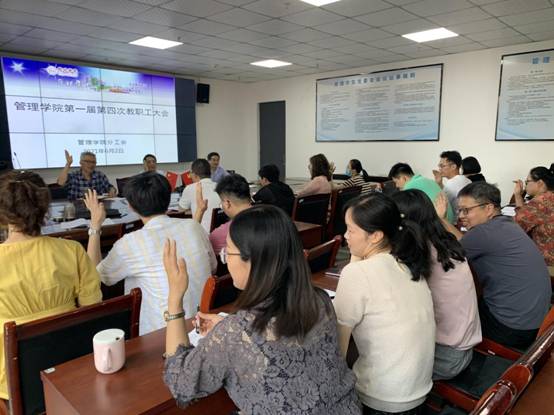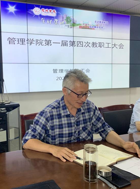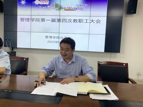 6月2日下午2:40,管理院第一届第四次教职工大会在实训楼C301会议室举行,全体教职工参加了会议,会议由管理院党委副书记王永宁主持。