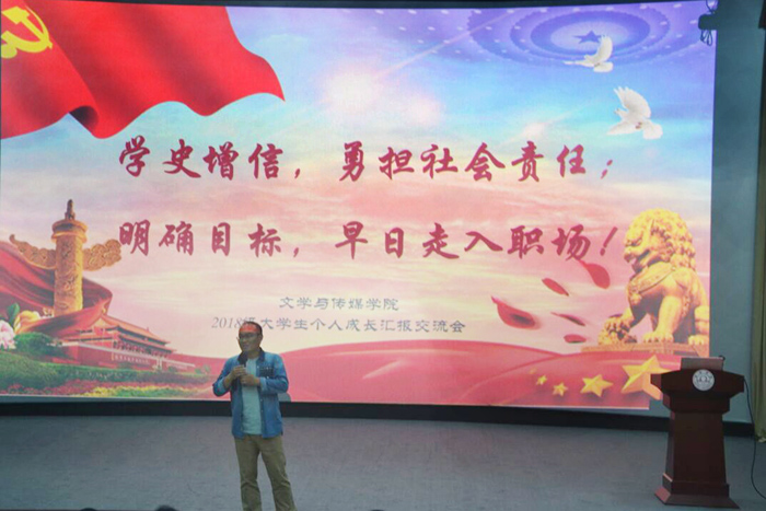为进一步帮助高年级学生正确认知自我,提高职业意识,明确职场目标,更好实现从学生到职场新人的转变,6月2日下午2:40,文学与传媒学院在报告厅举办2018级学生个人成长汇报交流会。文学与传媒学院党委书记李月云,辅导员王磊、刘影,2018级文化产业管理、2018级汉语言文学1班、2018级汉语言文学2班全体学生参加汇报交流会,汇报会由18级文化产业管理班团支书丁康主持。