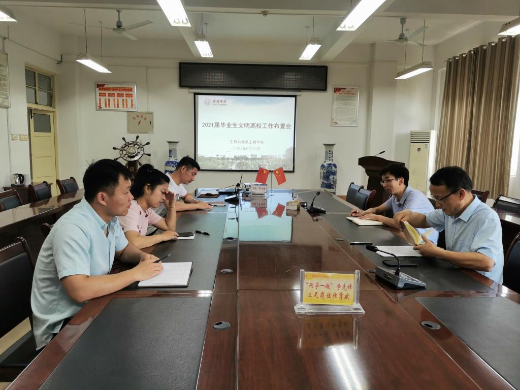 为确保2021届毕业生安全文明顺利离校,做好离校手续办理,服务和思想教育工作。6月23日下午,生物与食品工程学院在实验楼A206会议室组织召开2021届毕业生文明离校工作布置会议,会议由生工学院党委书记赵亮主持,副院长张兴桃、及毕业班辅导员(班主任)参加了会议。