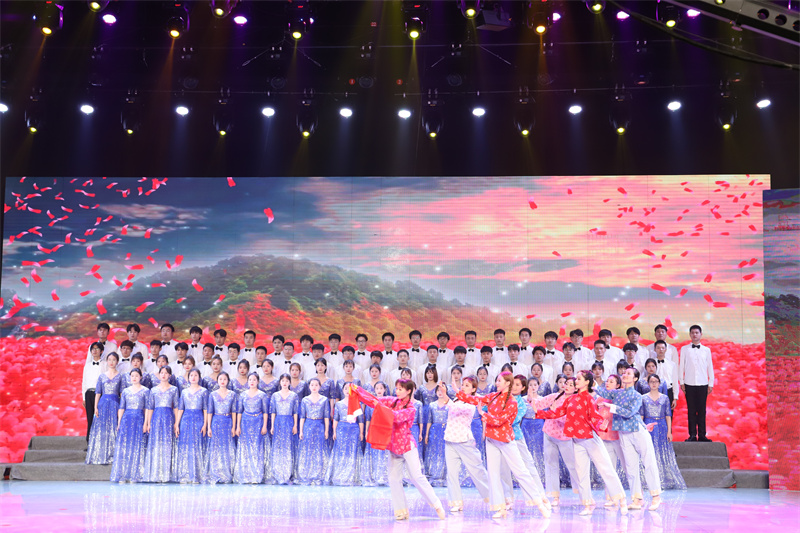 晚会在《唱支山歌给党听》中拉开序幕,参演人员声情并茂,表达了对党的赞美与热爱之情,将情感融进歌声,唱出了中国人民在党的领导下,民族振兴、国泰民安、人民幸福的自豪感。红歌联唱《延安颂》《怀念战友》《爱永在》用最朴实的语言诉说着爱党、爱国的心声。舞蹈《映山红》、歌曲《我们走在大路上》等节目轮番上阵,展示出新时代大学生的精神风貌、爱国情怀。赢得观众们的阵阵喝彩。演出尾声,伴随着《没有共产党就没有新中国》激昂的旋律,全场人员起立,满怀激情齐声歌唱,用歌声传递爱国声音、点燃爱国激情、凝聚爱国力量,将晚会表演气氛推向高潮。