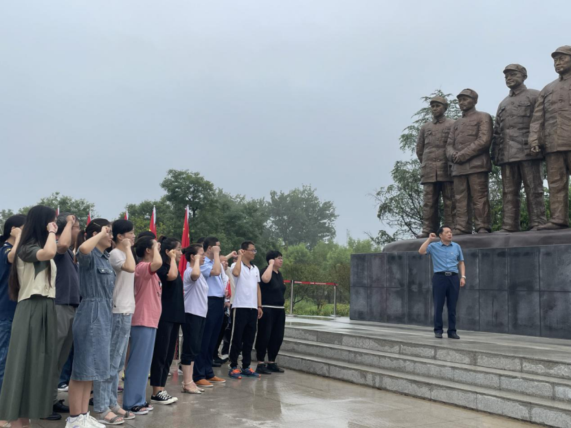 在五伟人铜像广场,刘大为带领全体教师党员面向鲜红的党旗,举起右拳庄严宣誓,重温入党誓词。随后,全体党员在讲解人员的指引下,观看了当年总前委会议开会的场景及部分实物,聆听了革命战争故事,缅怀了革命先烈,重走了红色征程,追忆了峥嵘岁月。