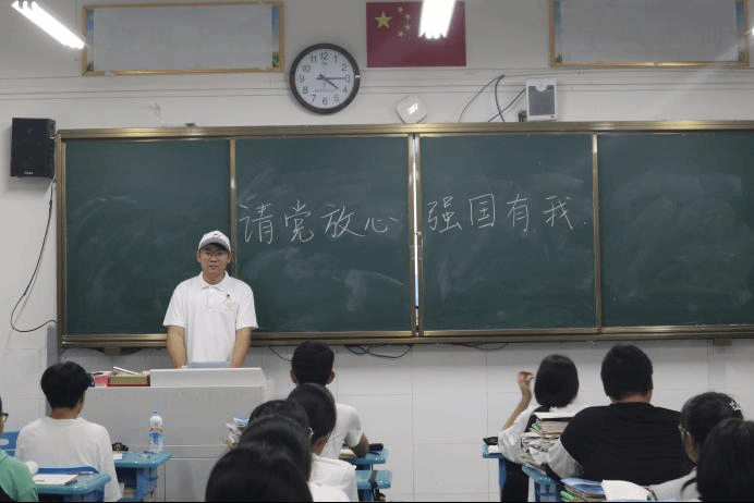 参观完党史馆后,实践团队人员冒雨来到肥西中学,因为暴雨团队里几乎每个人的鞋子都湿透了,裤子也被雨水打湿,但这些都没有阻止实践团队人员的脚步。在征得老师的同意下实践团队人员来到了同学们的班级里,在教室的黑板上写下了“永远跟党走,奋进新时代”几个大字,向在这里的准高三学生们宣传党史。学生们看见实践团队人员都很兴奋,对实践团队的每个人都很好奇。在说明来意后,同学们都很热烈地欢迎实践团队的到来,大家情不自禁地鼓起掌来欢迎宣讲人员。实践团队的宣讲也收到了很好的反馈,这些准高三同学们感慨自己受益匪浅,对我们的党史有了更深刻的了解。