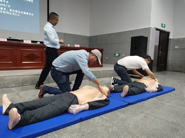 在应急救护知识培训讲座中,向斌通过视屏向大家展示了关于急救过程中的救治流程急,详细的介绍了运动性猝死及产生运动性猝死的原因及预防;向大家传授急救知识,教授如何进行运动性猝死判断和现场急救;最后向斌为大家讲解、示范徒手心肺复苏和自动体外除颤器(AED)的使用,向主任现场给大家示范AED的使用方法,如何正确的进行心肺复苏,李高书记和白明院长率先带头,积极参与模拟抢救练习,各位老师和测试员同学踊跃参与。