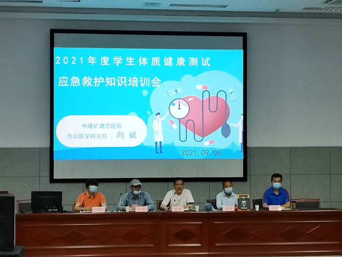 为了更安全有效地完成我校2021年度学生体质健康测试工作,提高我校师生对心肺复苏(CPR)的认知和救护水平,最大程度的避免运动中出现意外伤害事故的发生,在宿州学院体育运动委员会指导下,体育学院联合后勤与基建管理处,于2021年9月8日下午3点,特邀中煤矿建总医院急诊医学科向斌主任,在体育学院报告厅开展了应急救护知识培训讲座。体育学院党政主要负责同志、全体教职工和学生体质测试员150余人参与了此次讲座。