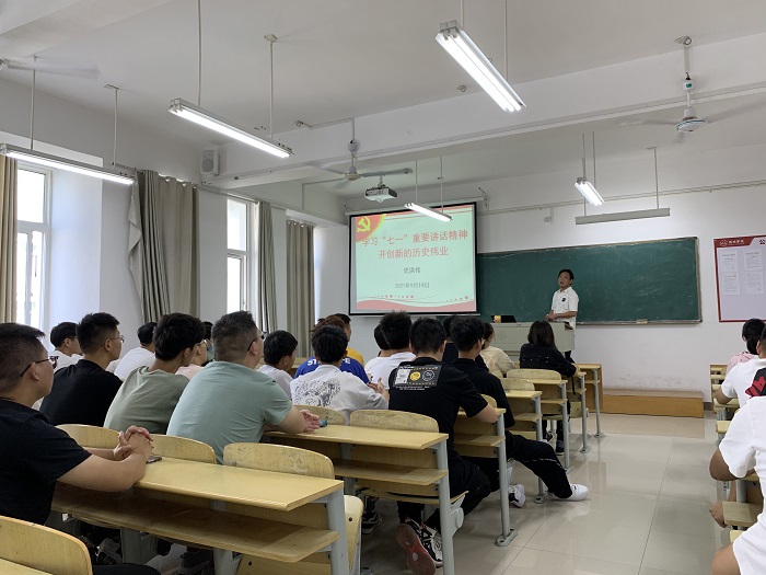 史洪伟主要围绕学习“七一”重要讲话精神开创新的历史伟业方面向新生展开介绍,让同学们了解党的政治宣言和行动纲领,党的新思想、新观点、新要求,以及党对我们的殷切期望。号召同学们要为实现人民对美好生活的向往不懈努力,引导同学们爱国、励志、求真、力行,争做社会主义核心价值观的坚定信仰者、积极传播者、模范践行者。