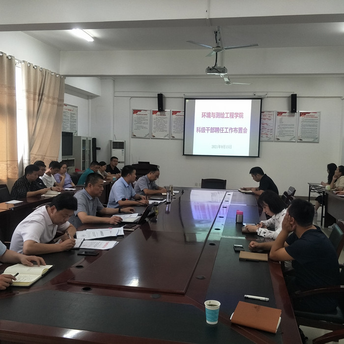 为进一步加强环测学院干部队伍建设,有序推进第五轮科级干部聘任工作,2021年9月15日下午,在工科楼A315召开了环境与测绘工程学院科级干部聘任工作布置会,学院全体教职工参加会议。会议由党委副书记(临时负责)胡冰主持。