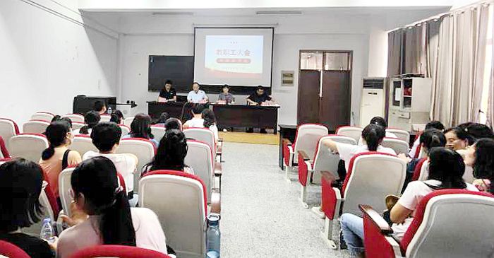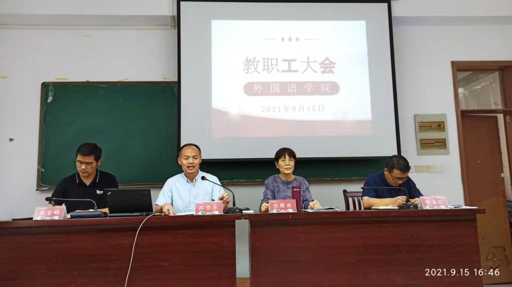 树新风、开新局、谱新篇,9月15日下午,我院在逸夫楼一楼报告厅召开全体教职工大会,党委副书记(临时负责)郝景东,党委副书记、院长张雁凌,党委副书记、纪委书记张亚锋,副院长胡永近及全体教职工参加大会。会议由郝景东主持。
