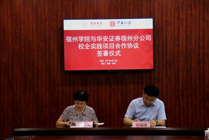 为加强校企合作,提高人才培养质量,拓宽毕业生实习、就业渠道,9月16日下午,数学与统计学院和华安证券宿州分公司校企合作签约仪式在宿州市证券大楼二楼会议室举行,全面开启校企合作。华安证券宿州分公司有限公司总经理张海峰、总经理助理王祎、数统学院副院长(临时负责)徐秀荣、副院长(教学)李耀红、副院长(科研)武以敏等人参加了会议。签约仪式由张海峰主持。