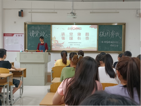 活动围绕党史教育,以“我和国旗合影”“请党放心,强国有我”主题团日活动两种形式分别开展,以直观的方式向国庆献礼、向祖国致敬。活动期间,班级负责人收集合影照片并带领同学们围绕践行“请党放心,强国有我”的庄严承诺,开展学习讨论,引导全体同学了解百年党史、厚植家国情怀,把爱党之心、感激党恩之情付诸于今后的工作生活和行动中,向党致以青春的礼赞。号召广大团员青年要高举理想信念的伟大旗帜,自觉担负起时代重任,不忘永远跟党走的初心使命,以青春活力和满腔热情,用激情和汗水书写亮丽青春。