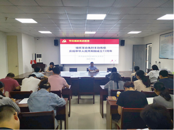 为庆祝中华人民共和国成立72周年,引导全院学好党史践行初心,赓续红色血脉,补足精神之钙,9月29日下午,学院党委于实训楼C301开展节日里的党史教育——缅怀革命先烈丰功伟绩,庆祝中华人民共和国成立72周年。党委书记蔡若愚主持学习,学院党委副书记张增林、副院长宋徽和全体教师参会。