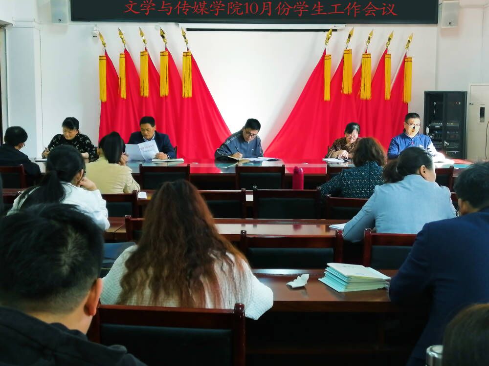 10月13日下午,文学与传媒学院召开10月份学生工作会议,会议由学院党委书记杨文艺主持,学院党政班子成员及全体教师参加了会议。
