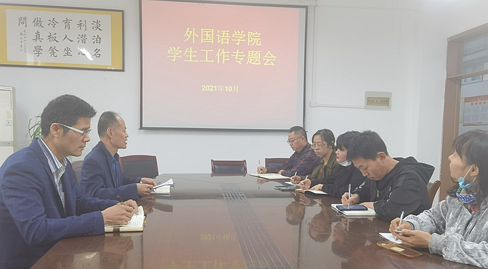 10月15日下午,外国语学院在逸夫楼A318召开了学生工作专题会议,会议由学院党委副书记(临时负责)郝景东主持,党委副书记张亚锋、学生管理科科长宋皓以及全体辅导员班主任参加了会议。