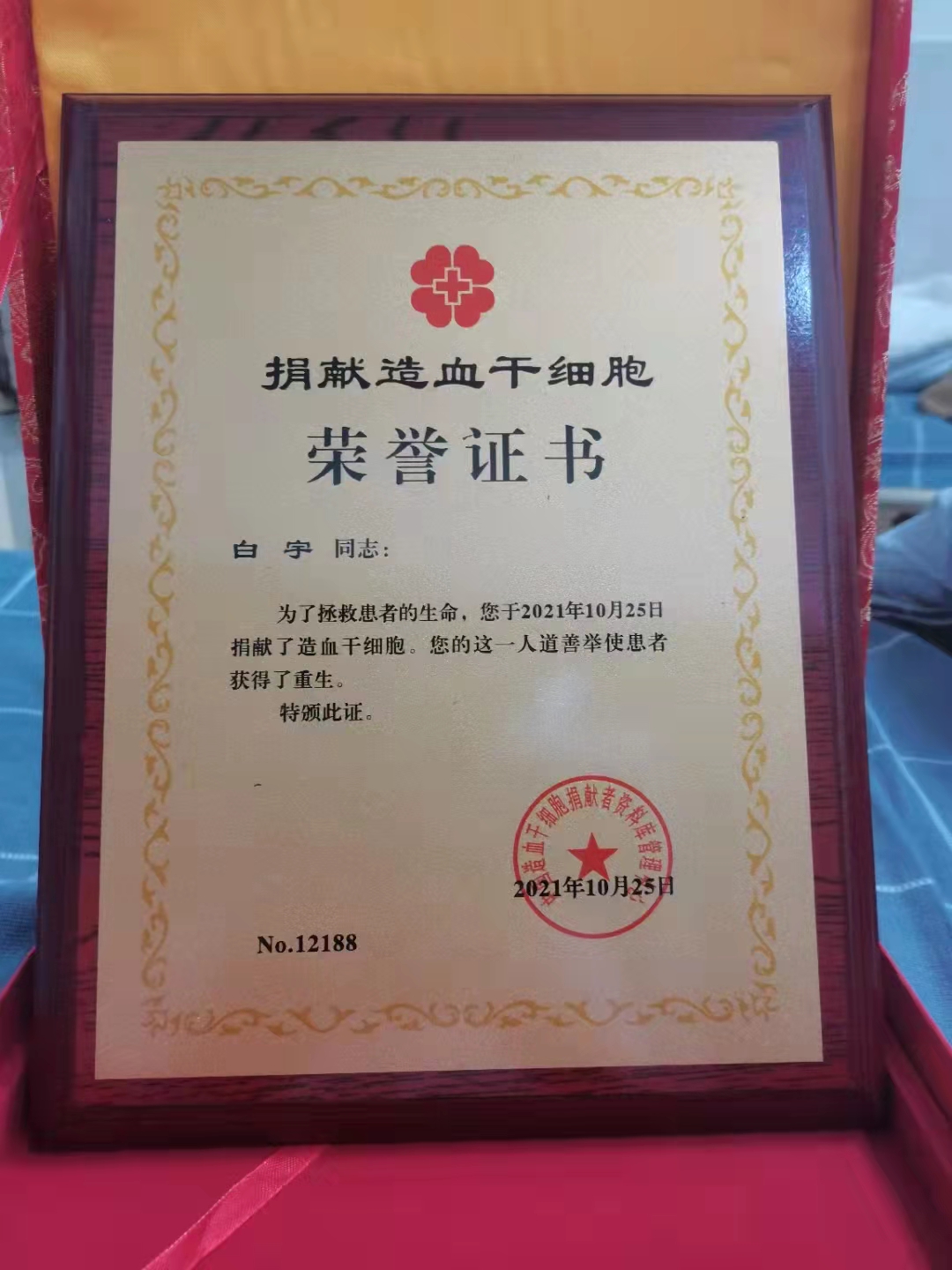 读大学期间,白宇自愿加入了干细胞捐献资料库。2020年,白宇考入华南理工大学研究生,当得知自己的干细胞与一名十一岁的患者配对成功时,他没有任何犹豫立即到医院接受干细胞采集。手术完成后,他说:“供者”的身份结束后,我多了一个妹妹,她将流着和我一样的血液,我会一直陪她走向新生的路。